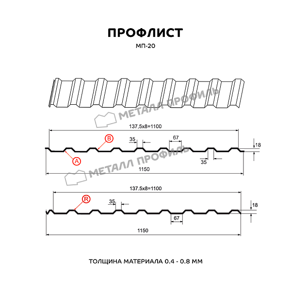 Профлист МЕТАЛЛ ПРОФИЛЬ МП-20x1100 часто используется для обустройства кровли. Представляет собой металлический оцинкованный лист с покрытием. Общая толщина стальной основы с оцинковкой и полимерным покрытием составляет 0.45 мм. После проката на специальном оборудовании металл принимает волнообразный вид. Жёсткость такого листа на порядок выше плоского.