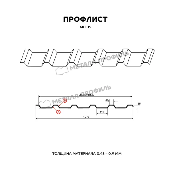 Профилированный лист МП-35 в равной степени подходит как для облицовки стен, заборов, так и для крыши, включая плоскую. Металлопрокат с этим профилем отличается рабочей шириной 1035 мм. Упростить монтаж кровли поможет изготовление листов индивидуальной длины, равной длине ската, но не более 12 метров. Успешно используется МП-35 и при возведении небольших каркасных зданий. Может быть использован в качестве несущих перегородок в хозяйственных сооружениях, ангарах. Для производства МП-35 берутся оцинкованные листы металла толщиной от 0,45 до 0,9 мм. Этот профиль не имеет специальных желобков или канавок, добавляющих ему жёсткость. Однако, правильная геометрия листа и классические трапециевидные волны обеспечивают изделию оптимальную несущую способность и стойкость к излому. Наличие широкой палитры оттенков и текстур в линейке полимерных покрытий позволит вам создать МП-35 практически с любым архитектурным решением.Покрытие PURMAN®: